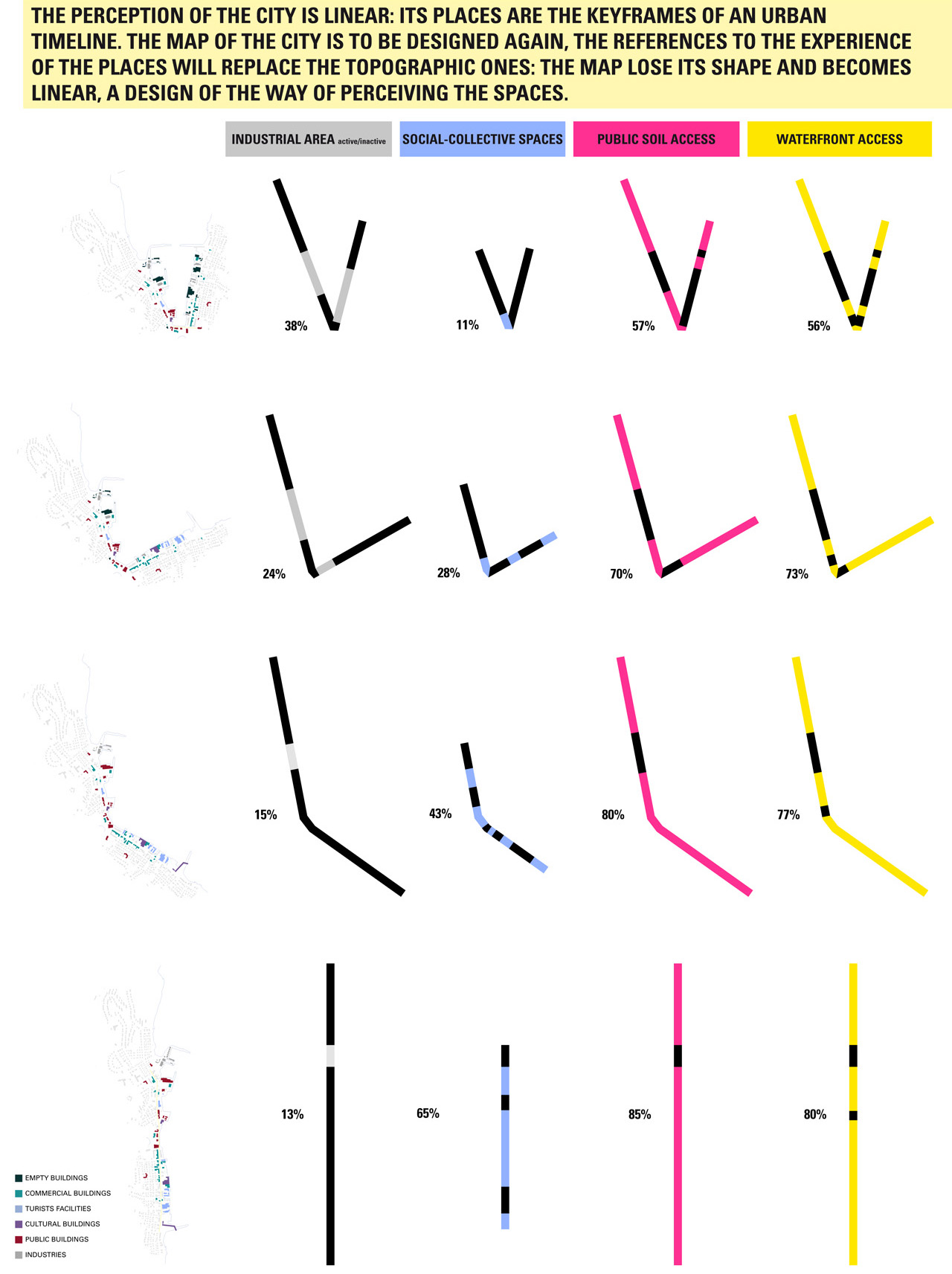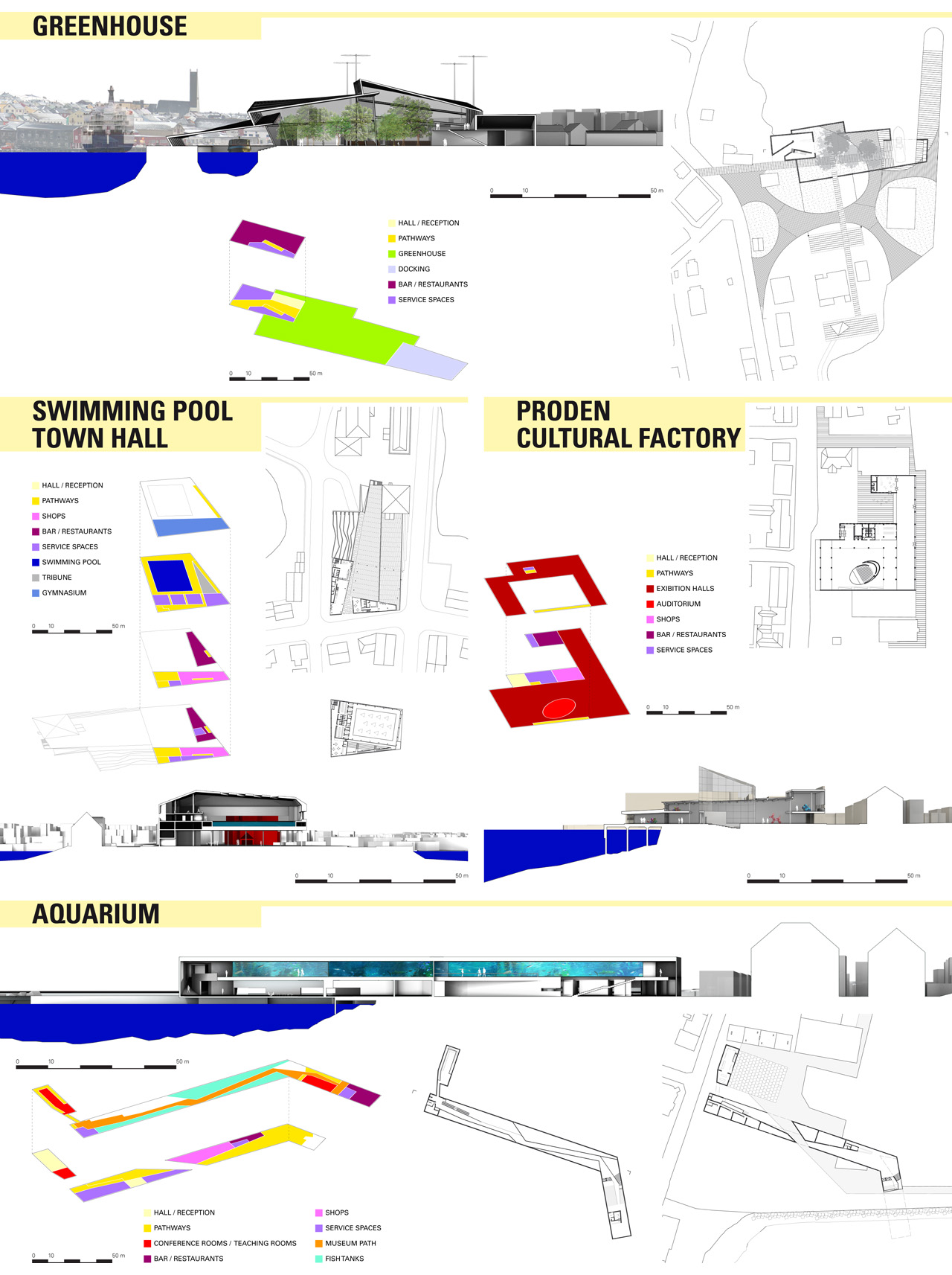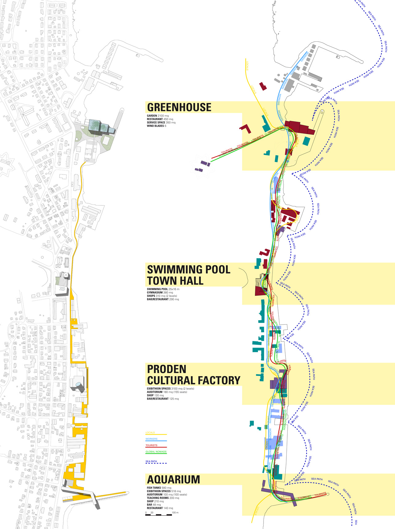 Il progetto prende in considerazione tutto il fronte mare del porto (la study area) in modo da prevederne una trasformazione organica. L'obiettivo principale è quello di strutturare la vita della città lungo un nuovo “asse”, estensione di quello mai completato di Kirkegata, che corre lungo il perimetro del porto. L'identificazione di questo nuovo percorso come nuovo asse strutturante della città è legata ad un cambiamento di punto di vista: l'uomo che percorre la città si sostituisce al progettista che la disegna dall'alto. La percezione della città è lineare: i luoghi sono keyframes di una timeline urbana. La carta di riferimento andrà ridisegnata, ai riferimenti topografici si sostituiscono quelli legati all'esperienza dei luoghi: la carta si deforma fino a divenire lineare, disegno di un modo di percepire gli spazi. Elementi cardine di questa operazione sono gli edifici dismessi, luoghi un-private della trasformazione che diventano collegamento mare-città e luogo di incontro per locals, short time workers, tourist and global nomad. L'identificazione di questo nuovo asse risponde al tema del concorso divenendo protagonista principale, ed elemento ordinatore, della “Conversione programmatica”: inquadramento generale per la trasformazione d'uso degli spazi e per l'insediando nuove funzioni, rivitalizza le parti abbandonate della città grazie ad una nuova maniera di abitare questi luoghi. Questa trasformazione, garantendo un notevole incremento dei suoli pubblici lungo il bordo del porto, coinvolge un sistema più ampio: millenium path, sea path (di nuova concezione), il sistema degli approdi e il nuovo asse. Nella zona terminale del porto a nord/ovest verrà mantenuta la funzione di porto industriale. Ma quale sarà la nuova economia di Vardø? Cosa renderà possibile, ed anzi auspicabile, l'abbandono della attuale attività peschereccia? Lo sviluppo futuro della città dovrà basarsi su quelle che sono le sue eccezionalità e che spesso sono considerate fattori sfavorevoli. Gli interventi saranno accomunati da alcuni concetti fondanti del progetto per la città: la condizione geografica estrema, la costruzione di nuovi spazi pubblici, il vento, l'insediamento di nuove attività, la mixture.