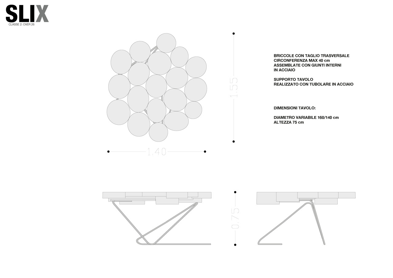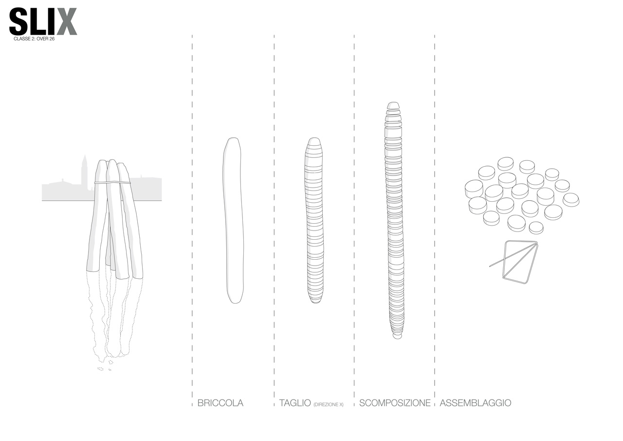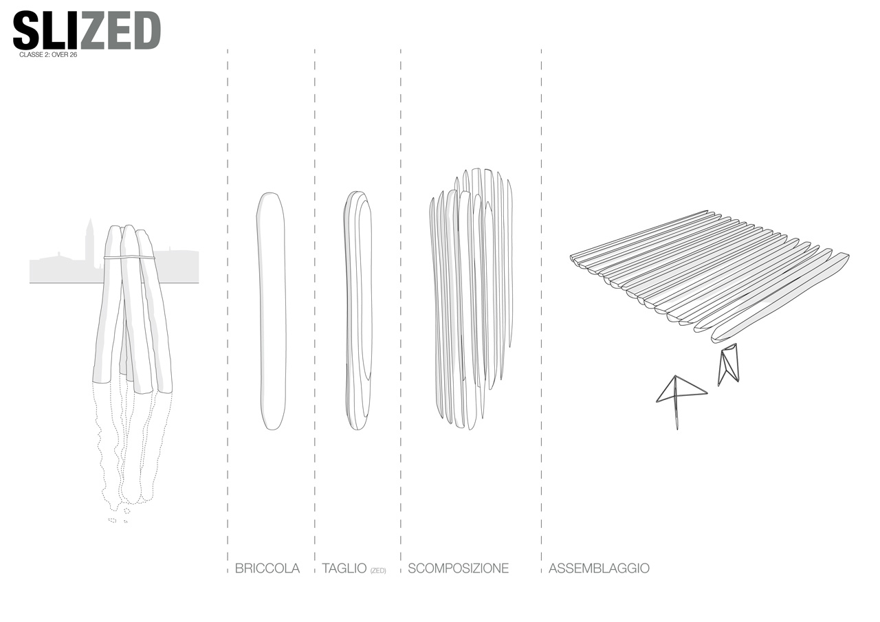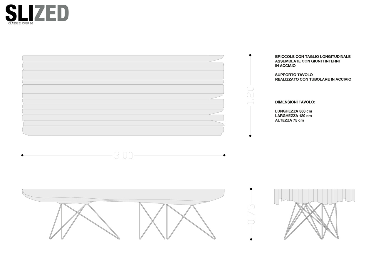 Il riciclo non è più espressione di un disagio economico. Il riciclo non è neanche più una questione di necessità. Il riciclo, adesso, è un processo virtuoso. L'estetica del riciclo è l'estetica della virtù. Non si ricicla più per non buttare. Il riciclo è espressione di un modo di vivere, di concepire l'esistenza, di rapportarsi al mondo, di sentirsi in continuità con la storia. SLIZED e SILX non usano le briccole come materiale di riciclo, ma le usano per quello che sono: elementi a cui viene data una seconda vita. Il taglio secco non altera la natura oggettuale della briccola. La briccola rimane briccola, viene solo trattata con metodi che non ne alterano l'aspetto ma ne garantiscano una corretta fruizione. I tavoli sono potenti e traggono la loro forza dalla rinnovata vita del materiale. L'unico elemento estraneo è il tubolare in acciaio cromato, che, da comprimario, non contende al piano del tavolo il ruolo di protagonista. Il progetto non è un oggetto, ma l'espressione di una precisa visione della contemporaneità.